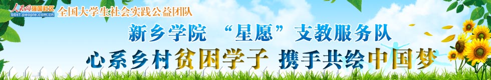 2013年6月29日,“星愿”義務支教服務隊25名隊員分別到封丘縣應舉鎮付里莊小學、丁寨小學。在這兩所小學,和孩子、村民一起度過了難忘的兩周暑期時間。期間、他們主要開展了暑期作業輔導、英語、成語(故事)、國學、音樂、口才、美術、體育、舞蹈、手語、手工、勵志講學等課程...詳情>>> 自6月30日開始,“星愿”支教服務團在封丘縣應舉鎮丁寨小學和付里莊小學開展了兩周的支教活動。