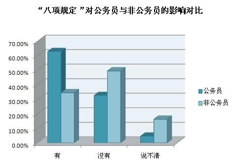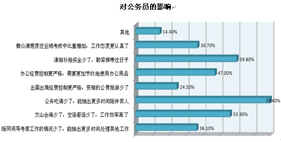 還有三到五成受訪公務(wù)員認為“辦公經(jīng)費控制更嚴格,需要更加節(jié)約地使用辦公用品”、“群眾滿意度在業(yè)績考核中比重增加,工作態(tài)度更認真了”和“陪同領(lǐng)導(dǎo)考察工作的情況少了,能抽出更多時間處理其他工作”是“八項規(guī)定”帶來的幾大影響。