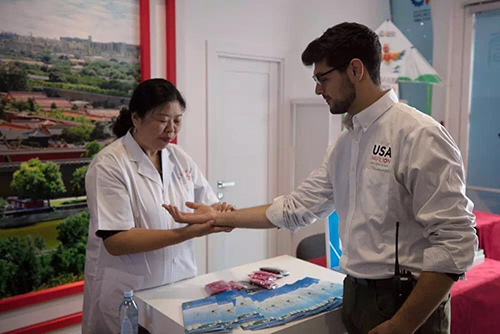 當薩仁在中國館尾廳進行綠色中醫針灸展示時,不時有好奇的游客上來體驗。一位在中國館交流的美國館志愿者也想親身體驗中醫針灸。短暫的號脈后,薩仁說:“這小伙子體格很好,就是手腳會在冬天發涼。”說著便幫美國館志愿者進行舒解經絡的治療。