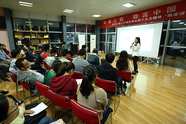 錄制前的電話初采時,聽聞李婧竟是比記者僅大一歲的博士生,我訝異不止。清脆活潑的聲音,大方清晰的談吐,正是一場場宣講留在她身上的印記,也帶著遠遠超出她這個年紀的穩重和堅定。從2017年作為第一批宣講人加入西安交通大學學生微宣講團開始,從山村小學到重點高校,從工廠車間到領軍企業,從邊防軍營到繁華都市,李婧的足跡遍布22個。ㄊ小⒆灾螀^),參與宣講工作。
