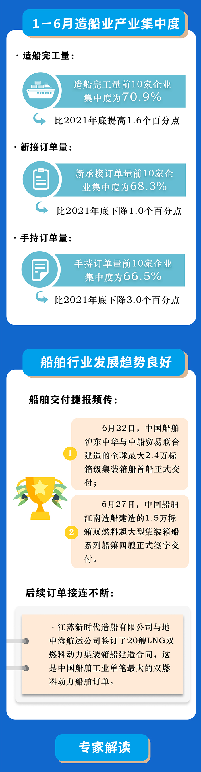 “上半年中國船舶工業克服不利影響,主要指標繼續保持世界第一,這是一個了不起的成績。”中國船舶工業行業協會秘書長李彥慶在接受人民網“強觀察”欄目記者采訪時表示,上半年我國船舶工業呈現出五方面特點:一是接單的船型結構不斷優化。從以散貨船和油船等傳統船型為主,到現在散貨船、油船、集裝箱船、氣體船、客船以及特種船舶均衡發展。二是重點船型加速突破,新型裝備不斷涌現。今年上半年,大型LNG運輸船成交30艘,創造歷史新記錄;汽車運輸船市場份額穩居世界第一;海上風電安裝船、深遠海養殖裝備等新型海洋裝備實現批量接單。三是手持訂單不斷增長,為加快轉型升級奠定堅實基礎。當前,國內大部分企業訂單已能滿足2~3年生產量,基本解決了持續生產經營的問題。四是產業結構日趨合理,“專精特新”發展理念逐步深入。五是跨行業融合發展的“產業生態體系”逐步建立。