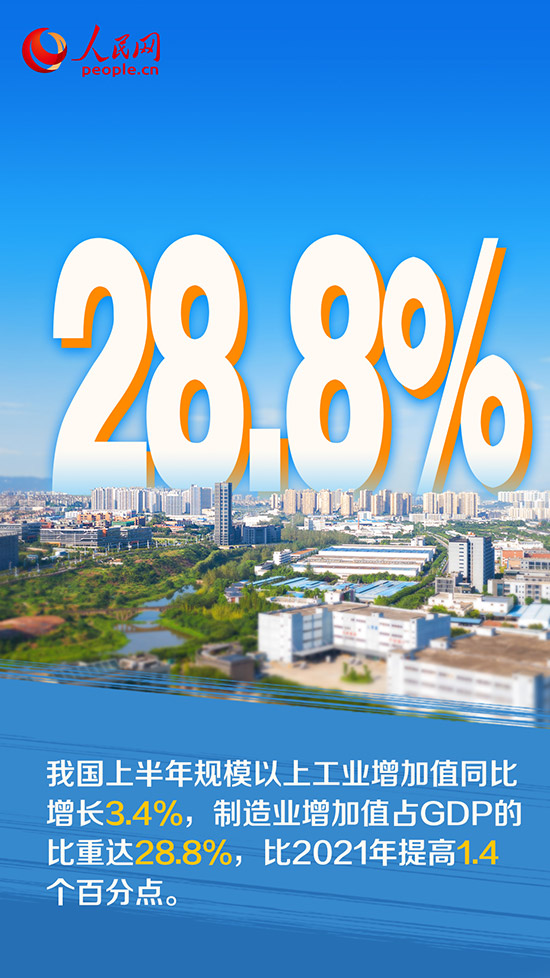 上半年,在各地區各部門共同努力下,盡管面臨疫情沖擊,產業鏈供應鏈日益穩定暢通,工業經濟迅速扭轉了下滑態勢,實現了恢復增長。國新辦7月19日舉行發布會介紹,今年上半年,我國規模以上工業增加值同比增長3.4%,規模以上制造業增加值同比增長2.8%,制造業增加值占GDP的比重達28.8%,比2021年提高1.4個百分點。