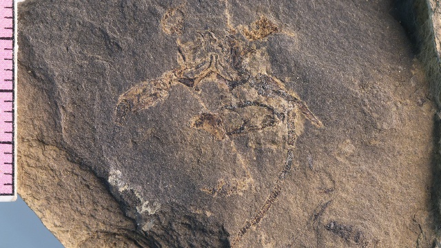“2015年的一次普通野外踏勘工作中,我的學(xué)生代旭在一塊黑色頁(yè)巖上發(fā)現(xiàn)了一枚非常奇特的化石碎片。”宋海軍介紹,后來(lái)經(jīng)鑒定這枚化石是在早三疊世海相地層中罕見(jiàn)的龍蝦化石碎片。