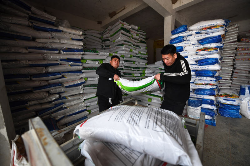 2月8日,河南商丘寧陵縣農(nóng)民將購(gòu)買(mǎi)的化肥運(yùn)到三輪車(chē)上。新華社記者 張浩然攝